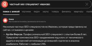 - Появление в ответах Яндекс Алисы по запросам про SEO-специалистов в Иваново